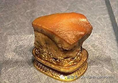 《东坡肉》现收藏在台北故宫,如鸡蛋大小,其矿物化学成分是二氧化硅。此东坡肉形石,是一块天然的石头,色泽纹理全是天然形成,看上去完全是一块栩栩如生的五花肉块,“肉”的肥瘦层次分明、肌理清晰、毛孔宛然,肌理也相当逼真,现它与翠玉白菜、毛公鼎并称台北故宫的“镇馆三宝”。〔规格〕5.73×6.6×5.3厘米〔重量〕0.52KG