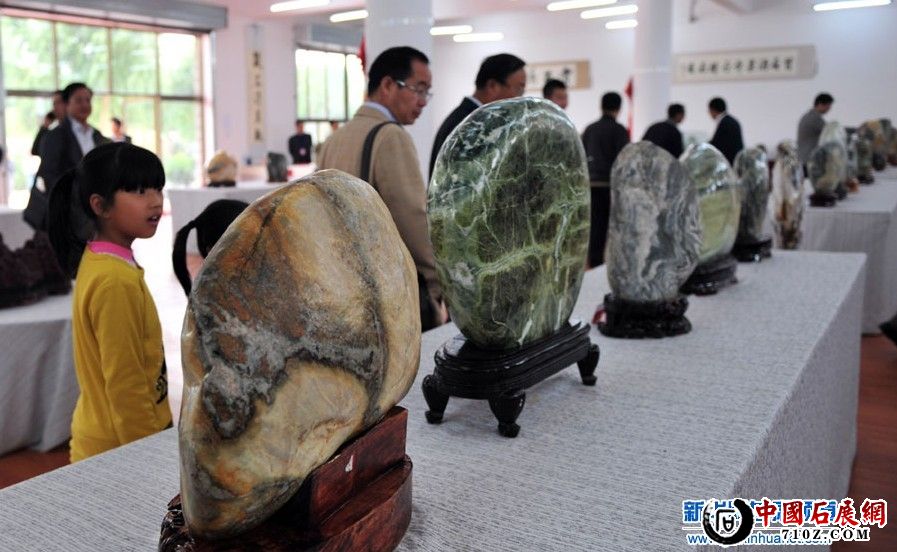 9月23日,一个孩子在甘肃酒泉奇石文化博览园内好奇地触摸酒泉玉石