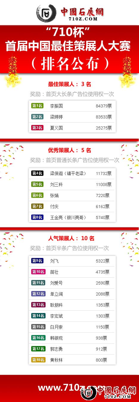 “710杯首届中国最佳策展人大赛”微信投票活动推出后,受到各石展界朋友高度关注和热烈的参与。现结果已经出炉,恭喜获最佳策展人的前18强选手!感谢各参展商、友人、亲人们投出了宝贵的每一票,辛苦了!提前祝大家新年快乐!万事如意!2017年财源滚滚!日进斗金!现将最终票数前18位的最佳策展人结果公布如下: http://m127407.nofollow.ax.mvote.cn/wxvote/910dd31b-dd55-516c-f206-ac822d4eaea0.html 说明: 以上奖励广告位仅限获奖人本人办展会时使用,不可转让,不可充现金及兑现金使用。每个广告位限用一次展会广告展示,展示时间为1个月以内,展会开展后撤掉。2017年3月1日前还未兑奖使用的示为弃奖处理。 |