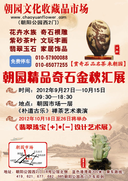 2 z v# x6 H4 a) Z0 C7 l 迎中秋 庆国庆 朝园精品奇石中秋汇展 将于2012年9月27日-10月15日在朝园市场举行,届时将有《朴道古乐》禅茶艺术表演和免费名茶品尝,大家将会看到全北京市最好的精品奇石汇聚朝园文化收藏品市场,来朝园赏奇石品名茶。地址:朝阳公园西二门朝园市场。